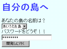 オーナーとして島に行く場合は、ゲームのトップページの最初の方にあった、 「自分の島へ」の所で島を選び、パスワードを入力し、 「開発しに行く」ボタンを押します。