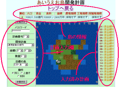 計画は、 計画番号、 開発計画の種類、 座標、 目標の島、 数量などを選択し、 計画送信ボタンを押すと登録されます。