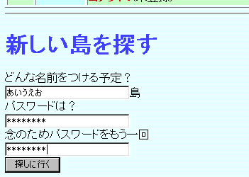自分の島を登録するには、ゲームのトップページにある、 「新しい島を探す」の所に、島の名前とパスワードを入力し、「探しに行く」ボタンを押します。
