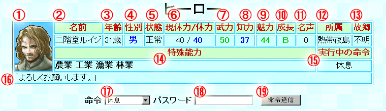 | 恋愛中 | 正常で休息中の時、たまに好きな相手を見つけて恋愛状態になります。 未婚の場合は結婚します。 休息以外のコマンドを受け付けなくなります。 女性が妊娠すると、恋愛状態は解除されます。 |